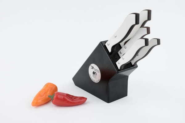 - Conjunto de 5 facas, em suporte de madeira com punhos em melamina / Phenolkraft e lâminas em aço inox [420 Mova].