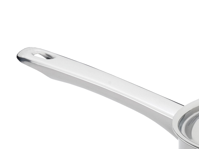 Aço inoxidável com acabamento polido. Apta para todas as fontes de calor incluindo indução.
