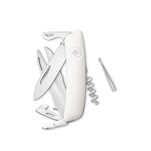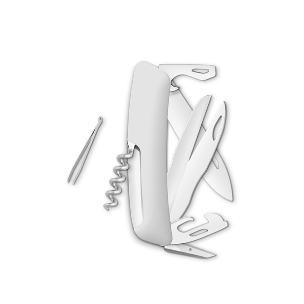 Ferramentas: Saca-rolhas “Sommelier” (garçons) com espiral de 5 voltas, Lâmina, 75 mm, Abridor de garrafas com chave de fenda nº 3 e dobrador de arame, Abridor de latas com chave de fenda nº 1, Perfurador / furador com olhal de costura, Anel, Trava de segurança, Pinça, 47 mm, Tesoura, 75 mm