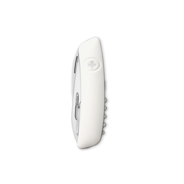 Lâmina com trava de segurança para evitar que feche durante a operação. A lâmina pode ser desbloqueada pressionando a cruz SWIZA.