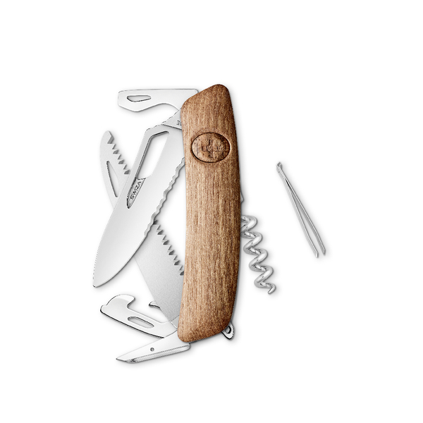 Ferramentas:Saca-rolhas “Sommelier” (garçons) com espiral de 5 voltas, Abridor de garrafas com chave de fenda nº 3 e dobrador de arame, Abridor de latas com chave de fenda nº 1, Furador / furador furador com olho de costura, Anel, Trava de segurança, Pinça, 47 mm, Lâmina para uma mão com borda ondulada, 75 mm, Serra de madeira com 31 dentes, 77 mm