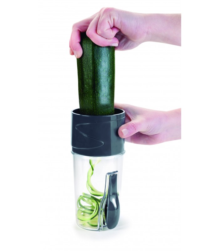 Cortador de vegetais em forma de talharins. Ideal para courgete, cenoura, nabo, beterraba, etc. Lâminas em aço inoxidável. Inclui um recipiente que serve para armazenamento de alimentos como sementes, um recipiente de armazenamento de 400ml com tampa para poder transportar para qualquer lugar e talheres.