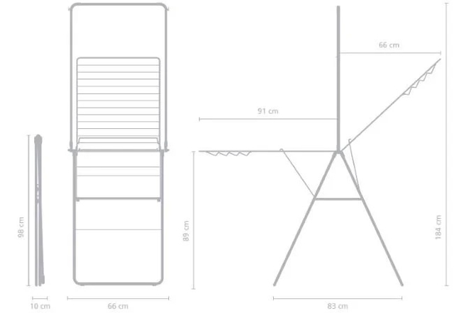 - Pode conter até três cargas de máquina de roupa – 25 metros de espaço de secagem mais vareta de suspensão.
