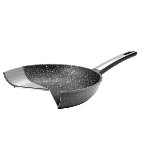 Uma sólida frigideira wok com um revestimento antiaderente rugoso e com as características de uma pedra natural não polida. Os alimentos são cozinhados uniformemente e sem queimar na superfície rugosa, preservando o seu sabor e suculência. Pode ser utilizada em todo o tipo de fogões – gás, elétrico, vitrocerâmica e indução. Pode ir à máquina de lavar louça. 5 anos de garantia.