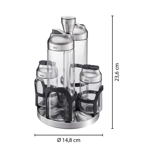 - 2 frascos de especiarias e ervas, 2 dispensadores de vinagre e azeite e um carrossel giratório.