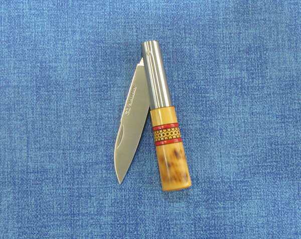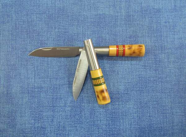 Faca clássica com cabo com decoração tradicional confecionada em goiva, recheada e finalizada com goma-laca.