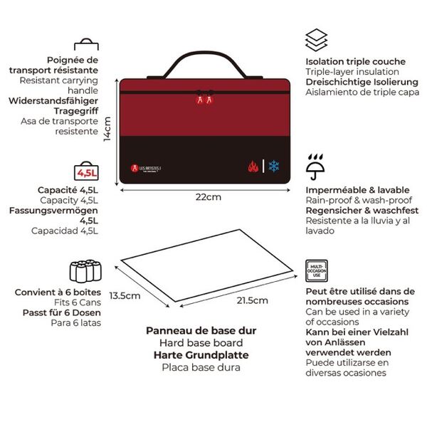 • Graças ao seu forro térmico, ele mantém seus alimentos e bebidas na temperatura ideal por horas.