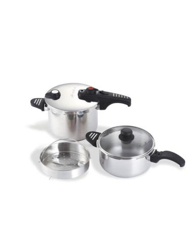 O conjunto de panelas de pressão G-Sola de 4 e 6 litros permite cozinhar rapidamente em qualquer tipo de fogo. Com seletor de pressão e sistema de segurança triplo. Panelas de pressão de aço inoxidável 18/10 de alta qualidade. Acabamento exterior. Marcação interna, com as capacidades de utilização da panela. Os níveis de cozedura são exibidos pelos anéis coloridos. Dois níveis de cozedura: rápido e super rápido. Fecho fácil e seguro, a alça ergonômica permite uma abertura simples e prática. Sistema de segurança triplo.