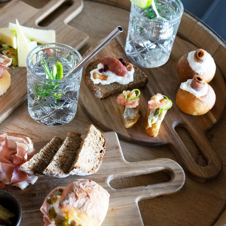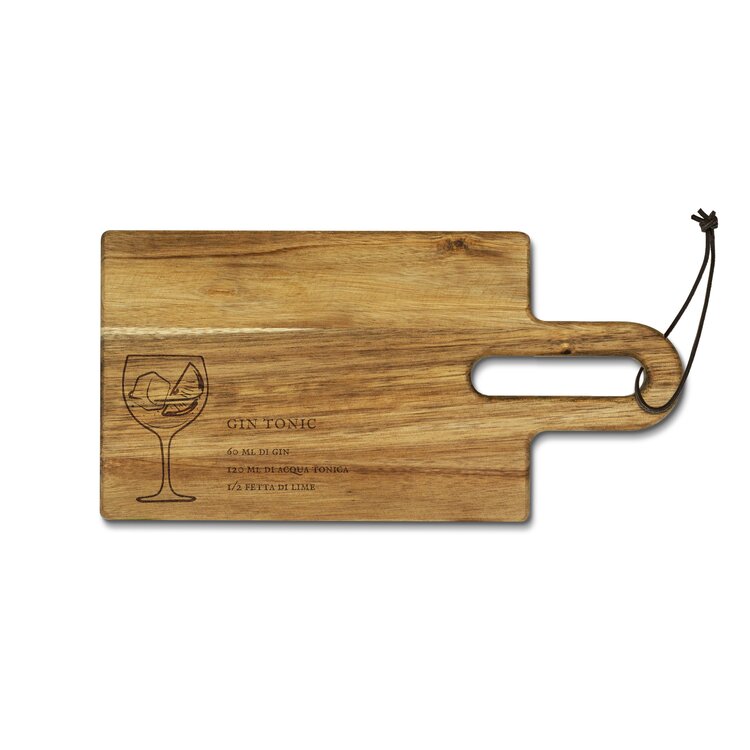 Tábua de corte em madeira de acácia FSC®, com receita de cocktail gravada. Pega com furo e cordão para pendurar.