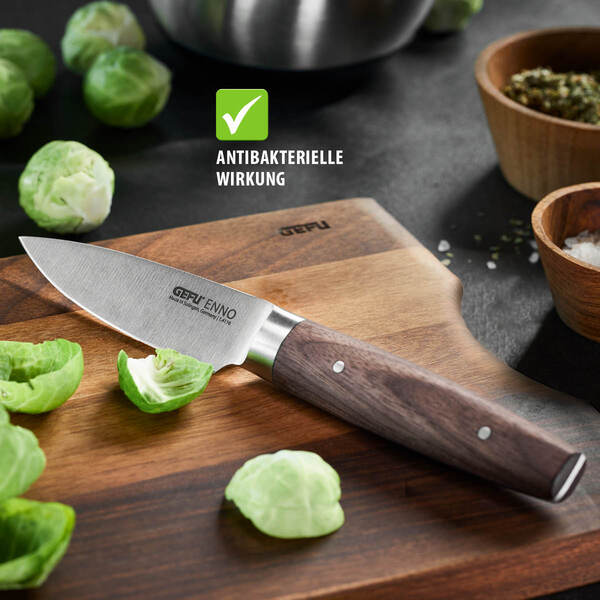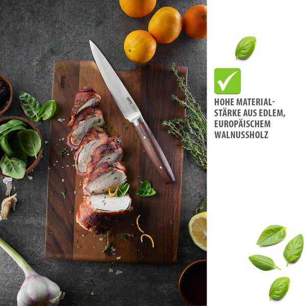Cortar pode ser assim tão belo. A Enno é feita de madeira de nogueira rica e robusta, o que lhe confere um visual único e de alta qualidade. A Enno é perfeita para cortar frutas, vegetais, carne ou peixe sem esforço, ao mesmo tempo que protege a lâmina da faca, tornando-a uma verdadeira mais valia para qualquer cozinha.